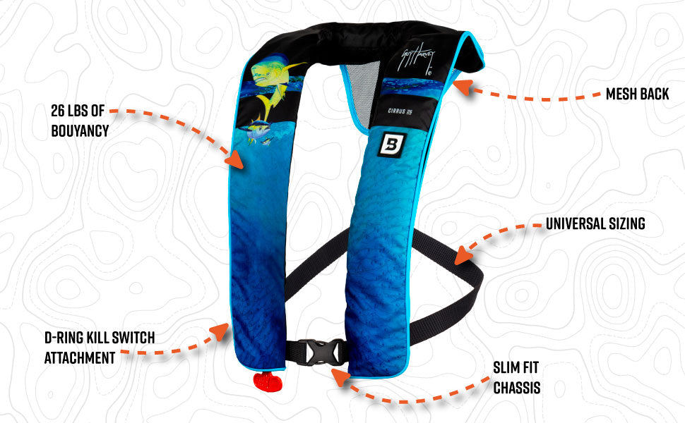 Immerse your self in world-renowned artist Guy Harvey patterns on the Bluestorm Cirrus 26 U.S. Coast Guard Approved Type V life jacket. Optimal protection even though you’ll be on shore long before the storm hits. These light slim fit vests are perfect for forgetting you are wearing them until the moment you need them. The Cirrus 26 provide almost twice the buoyancy of a foam PFD. You will be hard to miss with these amazing Guy Harvey patterns when paired with the new Glowspot air chamber material by Erez. GlowSpot® provides visible light at a range between 1-20 candelas per square meter (cd/m²) - 5 times more reflective than fabrics commonly used in life-jacket bladders.